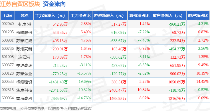 从资金流向上来看,当日江苏自贸区板块主力资金净流出5383.05万元,游资资金净流入2661.8万元,散户资金净流入2721.25万元。江苏自贸区板块个股资金流向见下表: