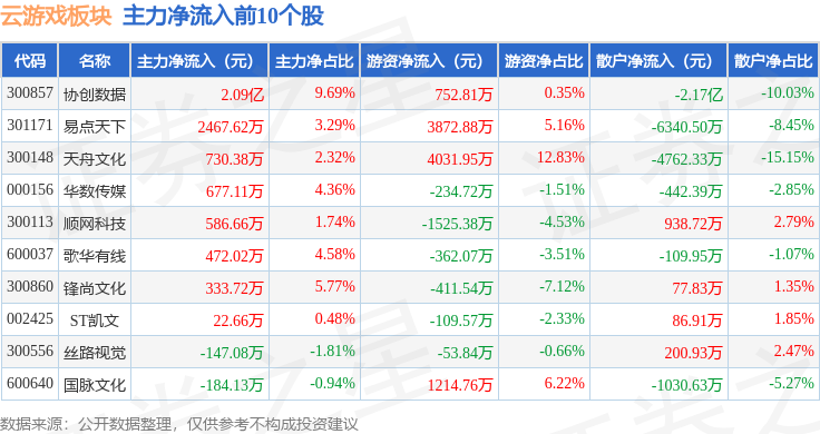 从资金流向上来看,当日云游戏板块主力资金净流出21.59亿元,游资资金净流入9.55亿元,散户资金净流入12.04亿元。云游戏板块个股资金流向见下表: