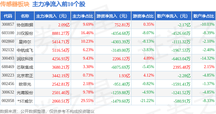 从资金流向上来看,当日传感器板块主力资金净流出42.8亿元,游资资金净流入15.41亿元,散户资金净流入27.39亿元。传感器板块个股资金流向见下表: