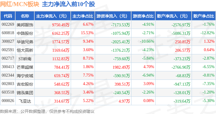 从资金流向上来看,当日网红/MCN板块主力资金净流出33.13亿元,游资资金净流入9.68亿元,散户资金净流入23.45亿元。网红/MCN板块个股资金流向见下表:
