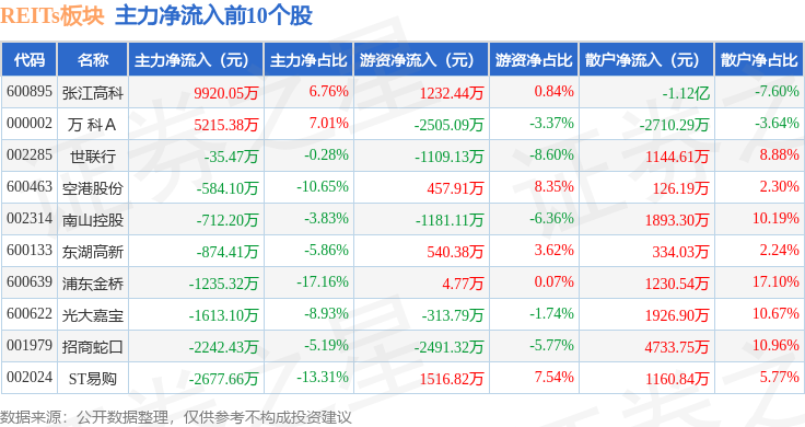 从资金流向上来看,当日REITs板块主力资金净流出4.2亿元,游资资金净流入166.76万元,散户资金净流入4.19亿元。REITs板块个股资金流向见下表: