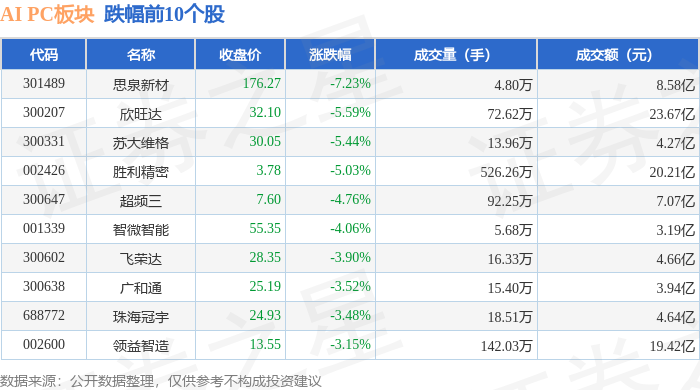 证券之星消息,11月14日AI PC板块较上一交易日下跌2.1%,思泉新材领跌。当日上证指数报收于3990.49,下跌0.97%。深证成指报收于13216.03,下跌1.93%。AI PC板块个股涨跌见下表:
