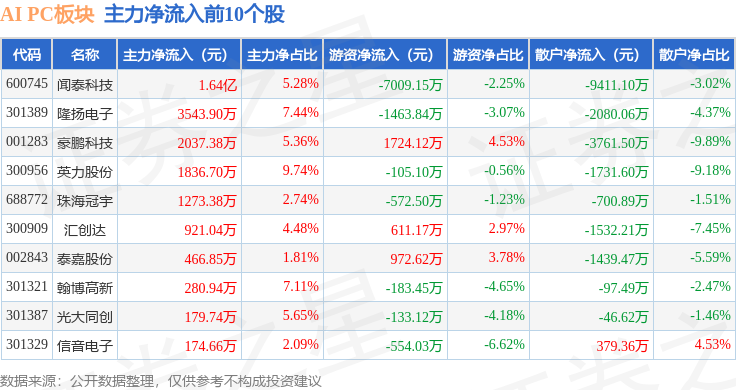 从资金流向上来看,当日AI PC板块主力资金净流出15.15亿元,游资资金净流入7472.54万元,散户资金净流入14.4亿元。AI PC板块个股资金流向见下表: