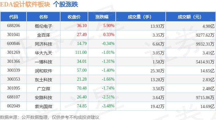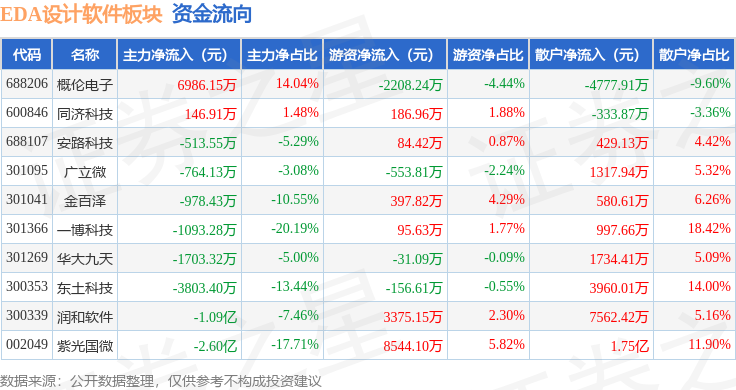 从资金流向上来看,当日EDA设计软件板块主力资金净流出3.87亿元,游资资金净流入9734.32万元,散户资金净流入2.89亿元。EDA设计软件板块个股资金流向见下表: