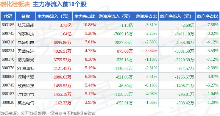 从资金流向上来看,当日碳化硅板块主力资金净流出11.02亿元,游资资金净流入1407.84万元,散户资金净流入10.87亿元。碳化硅板块个股资金流向见下表: