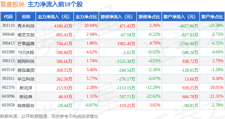 从资金流向上来看,当日盲盒板块主力资金净流出2.18亿元,游资资金净流入1.11亿元,散户资金净流入1.07亿元。盲盒板块个股资金流向见下表: