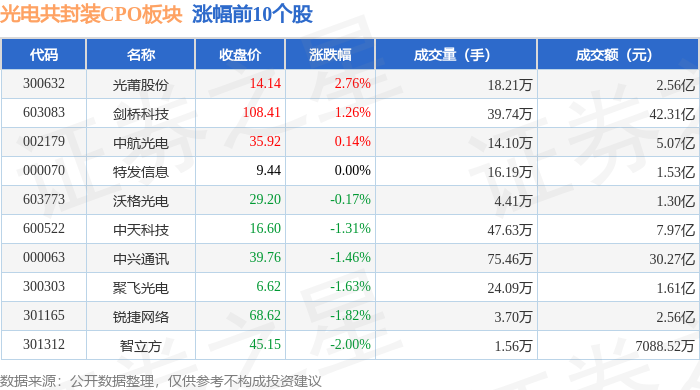 证券之星消息,11月14日光电共封装CPO板块较上一交易日下跌3.36%,源杰科技领跌。当日上证指数报收于3990.49,下跌0.97%。深证成指报收于13216.03,下跌1.93%。光电共封装CPO板块个股涨跌见下表: