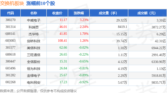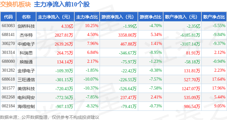 从资金流向上来看,当日交换机板块主力资金净流出15.96亿元,游资资金净流入3.05亿元,散户资金净流入12.91亿元。交换机板块个股资金流向见下表: