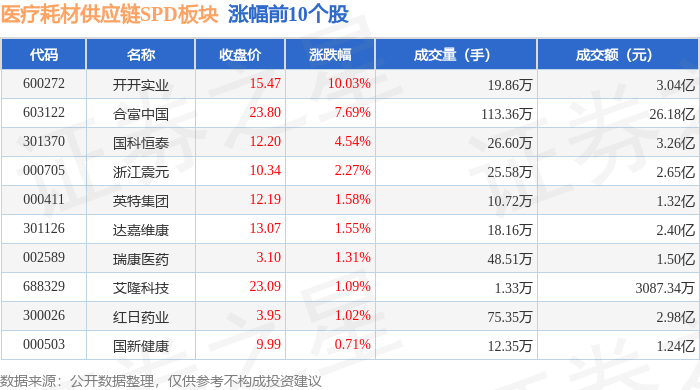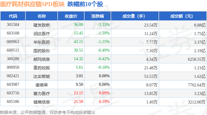 从资金流向上来看,当日医疗耗材供应链SPD板块主力资金净流出3.77亿元,游资资金净流出5741.36万元,散户资金净流入4.34亿元。医疗耗材供应链SPD板块个股资金流向见下表: