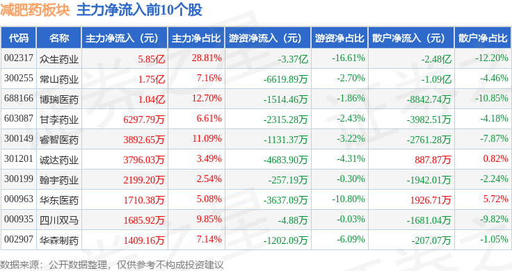 从资金流向上来看,当日减肥药板块主力资金净流入7.75亿元,游资资金净流出5.39亿元,散户资金净流出2.35亿元。减肥药板块个股资金流向见下表: