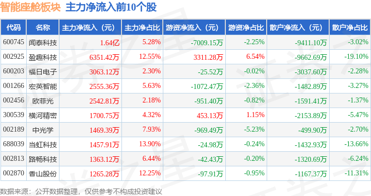 从资金流向上来看,当日智能座舱板块主力资金净流出14.91亿元,游资资金净流入4.0亿元,散户资金净流入10.91亿元。智能座舱板块个股资金流向见下表: