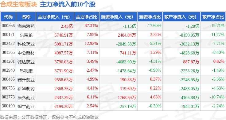 从资金流向上来看,当日合成生物板块主力资金净流出7.29亿元,游资资金净流入1.7亿元,散户资金净流入5.6亿元。合成生物板块个股资金流向见下表: