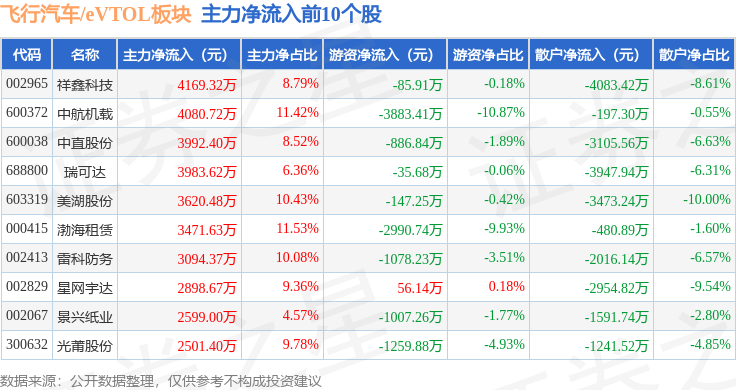 从资金流向上来看,当日飞行汽车/eVTOL板块主力资金净流出21.16亿元,游资资金净流入2.12亿元,散户资金净流入19.04亿元。飞行汽车/eVTOL板块个股资金流向见下表: