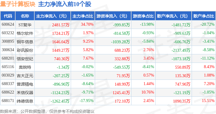 从资金流向上来看,当日量子计算板块主力资金净流出9.53亿元,游资资金净流入4.65亿元,散户资金净流入4.88亿元。量子计算板块个股资金流向见下表: