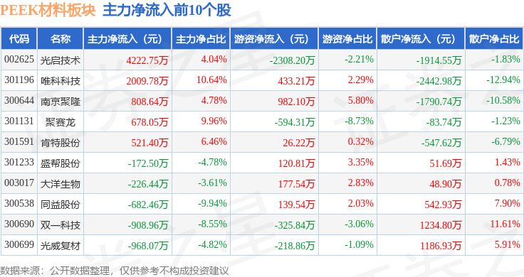 从资金流向上来看,当日PEEK材料板块主力资金净流出15.76亿元,游资资金净流入3.79亿元,散户资金净流入11.97亿元。PEEK材料板块个股资金流向见下表: