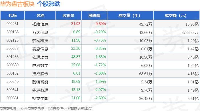 证券之星消息,11月14日华为盘古板块较上一交易日下跌1.08%,视觉中国领跌。当日上证指数报收于3990.49,下跌0.97%。深证成指报收于13216.03,下跌1.93%。华为盘古板块个股涨跌见下表: