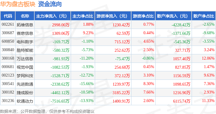从资金流向上来看,当日华为盘古板块主力资金净流出1.43亿元,游资资金净流入8638.17万元,散户资金净流入5655.41万元。华为盘古板块个股资金流向见下表: