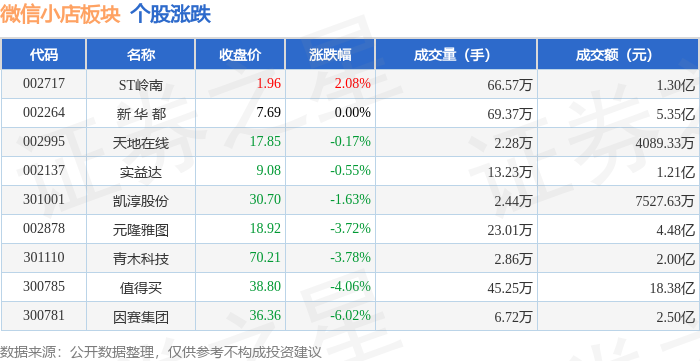 证券之星消息,11月14日微信小店板块较上一交易日下跌2.38%,因赛集团领跌。当日上证指数报收于3990.49,下跌0.97%。深证成指报收于13216.03,下跌1.93%。微信小店板块个股涨跌见下表:
