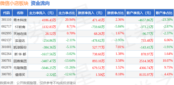 从资金流向上来看,当日微信小店板块主力资金净流出2.85亿元,游资资金净流入1.72亿元,散户资金净流入1.14亿元。微信小店板块个股资金流向见下表: