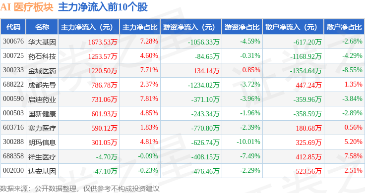 从资金流向上来看,当日AI 医疗板块主力资金净流出1.53亿元,游资资金净流出697.87万元,散户资金净流入1.6亿元。AI 医疗板块个股资金流向见下表: