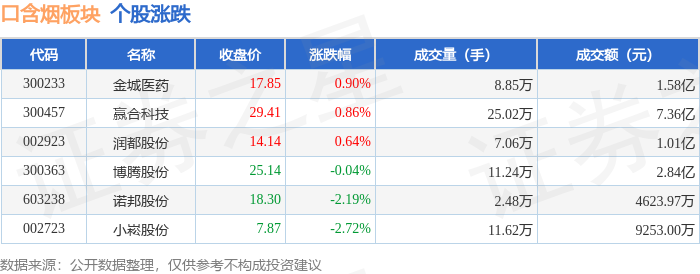 证券之星消息,11月14日口含烟板块较上一交易日上涨0.2%,金城医药领涨。当日上证指数报收于3990.49,下跌0.97%。深证成指报收于13216.03,下跌1.93%。口含烟板块个股涨跌见下表:
