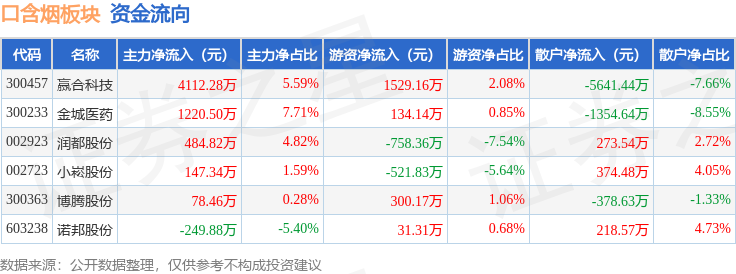 从资金流向上来看,当日口含烟板块主力资金净流入5793.53万元,游资资金净流入714.6万元,散户资金净流出6508.13万元。口含烟板块个股资金流向见下表: