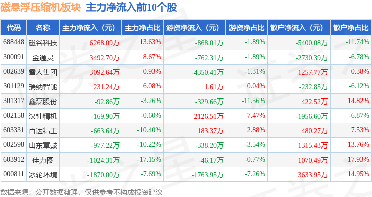 从资金流向上来看,当日磁悬浮压缩机板块主力资金净流出1050.81万元,游资资金净流出5320.95万元,散户资金净流入6371.76万元。磁悬浮压缩机板块个股资金流向见下表: