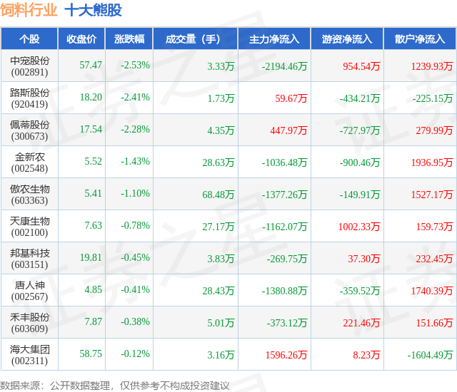 个股表现方面,饲料行业当日领跌股为中宠股份(002891),该股当日报收57.47,下跌2.53%,成交量3.33万,主力资金净流出2194.46万元。路斯股份(920419)以下跌2.41%紧随其后,该股当日成交量1.73万,主力资金净流入59.67万元。除此之外,佩蒂股份(300673)、金新农(002548)、傲农生物(603363)均进入当日熊股之列。具体个股列表见下表: