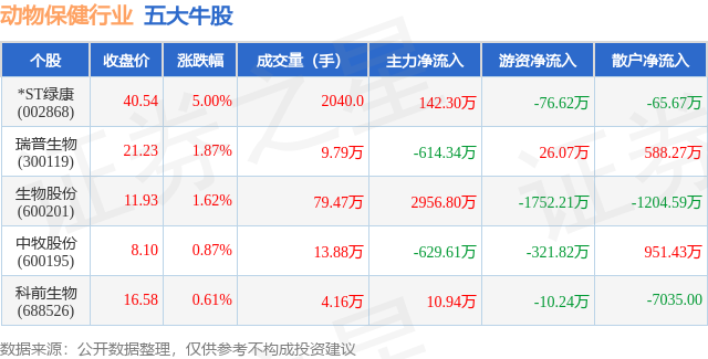 个股表现方面,动物保健行业当日领涨股为*ST绿康(002868),该股当日报收40.54,上涨5.0%,成交量2040.0,主力资金净流入142.3万元。瑞普生物(300119)以上涨1.87%紧随其后,该股当日成交量9.79万,主力资金净流出614.34万元。除此之外,生物股份(600201)、中牧股份(600195)、科前生物(688526)均进入当日牛股之列。具体个股列表见下表: