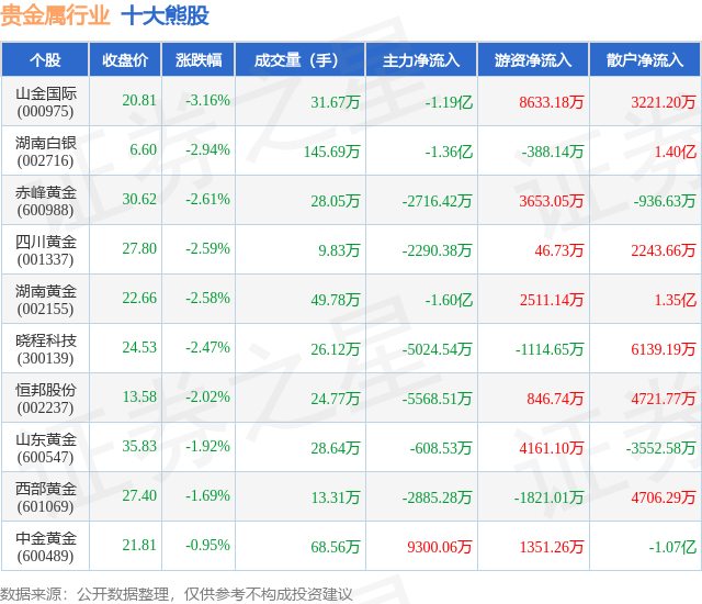 个股表现方面,贵金属行业当日领跌股为山金国际(000975),该股当日报收20.81,下跌3.16%,成交量31.67万,主力资金净流出1.19亿元。湖南白银(002716)以下跌2.94%紧随其后,该股当日成交量145.69万,主力资金净流出1.36亿元。除此之外,赤峰黄金(600988)、四川黄金(001337)、湖南黄金(002155)均进入当日熊股之列。具体个股列表见下表: