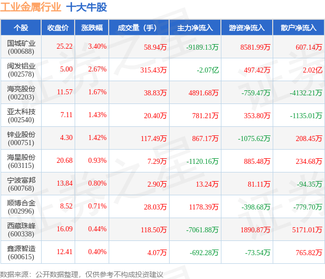 个股表现方面,工业金属行业当日领涨股为国城矿业(000688),该股当日报收25.22,上涨3.4%,成交量58.94万,主力资金净流出9189.13万元。闽发铝业(002578)以上涨2.67%紧随其后,该股当日成交量315.43万,主力资金净流出2.07亿元。除此之外,海亮股份(002203)、亚太科技(002540)、锌业股份(000751)均进入当日牛股之列。具体个股列表见下表: