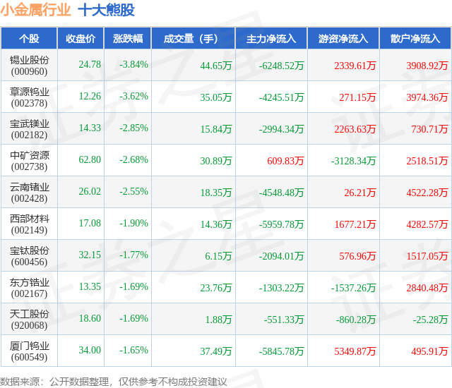 个股表现方面,小金属行业当日领跌股为锡业股份(000960),该股当日报收24.78,下跌3.84%,成交量44.65万,主力资金净流出6248.52万元。章源钨业(002378)以下跌3.62%紧随其后,该股当日成交量35.05万,主力资金净流出4245.51万元。除此之外,宝武镁业(002182)、中矿资源(002738)、云南锗业(002428)均进入当日熊股之列。具体个股列表见下表: