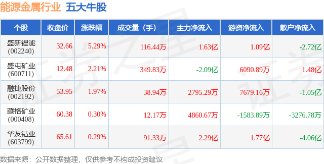 个股表现方面,能源金属行业当日领涨股为盛新锂能(002240),该股当日报收32.66,上涨5.29%,成交量116.44万,主力资金净流入1.63亿元。盛屯矿业(600711)以上涨2.21%紧随其后,该股当日成交量349.83万,主力资金净流出2.09亿元。除此之外,融捷股份(002192)、藏格矿业(000408)、华友钴业(603799)均进入当日牛股之列。具体个股列表见下表: