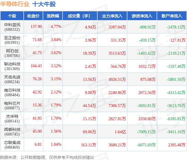 个股表现方面,半导体行业当日领涨股为中科蓝讯(688332),该股当日报收137.9,上涨4.77%,成交量4.94万,主力资金净流入3287.04万元。至正股份(603991)以上涨3.84%紧随其后,该股当日成交量3.96万,主力资金净流入331.35万元。除此之外,阿石创(300706)、联动科技(301369)、天岳先进(688234)均进入当日牛股之列。具体个股列表见下表: