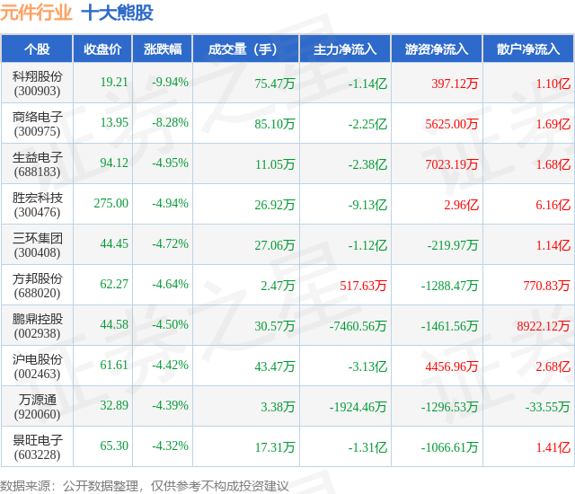 个股表现方面,元件行业当日领跌股为科翔股份(300903),该股当日报收19.21,下跌9.94%,成交量75.47万,主力资金净流出1.14亿元。商络电子(300975)以下跌8.28%紧随其后,该股当日成交量85.1万,主力资金净流出2.25亿元。除此之外,生益电子(688183)、胜宏科技(300476)、三环集团(300408)均进入当日熊股之列。具体个股列表见下表: