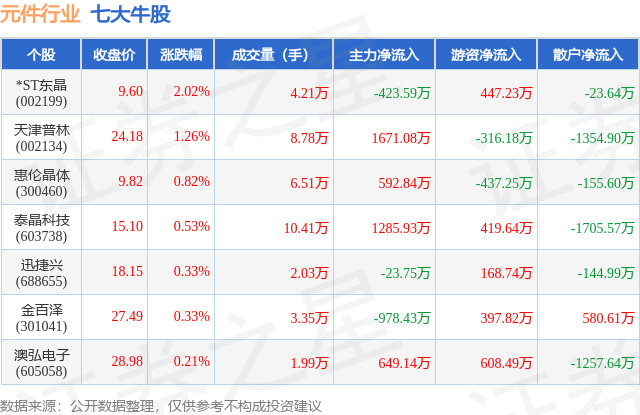 个股表现方面,元件行业当日领涨股为*ST东晶(002199),该股当日报收9.6,上涨2.02%,成交量4.21万,主力资金净流出423.59万元。天津普林(002134)以上涨1.26%紧随其后,该股当日成交量8.78万,主力资金净流入1671.08万元。除此之外,惠伦晶体(300460)、泰晶科技(603738)、迅捷兴(688655)均进入当日牛股之列。具体个股列表见下表:
