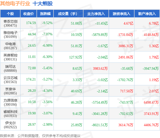 个股表现方面,其他电子行业当日领跌股为香农芯创(300475),该股当日报收174.59,下跌9.52%,成交量51.08万,主力资金净流出11.45亿元。雅创电子(301099)以下跌7.07%紧随其后,该股当日成交量10.59万,主力资金净流出5879.89万元。除此之外,中电港(001287)、英唐智控(300131)、瑞可达(688800)均进入当日熊股之列。具体个股列表见下表: