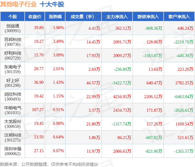 个股表现方面,其他电子行业当日领涨股为创益通(300991),该股当日报收39.89,上涨3.88%,成交量4.41万,主力资金净流入362.12万元。百邦科技(300736)以上涨3.49%紧随其后,该股当日成交量14.45万,主力资金净流入2091.71万元。除此之外,好利科技(002729)、东南电子(301359)、好上好(001298)均进入当日牛股之列。具体个股列表见下表: