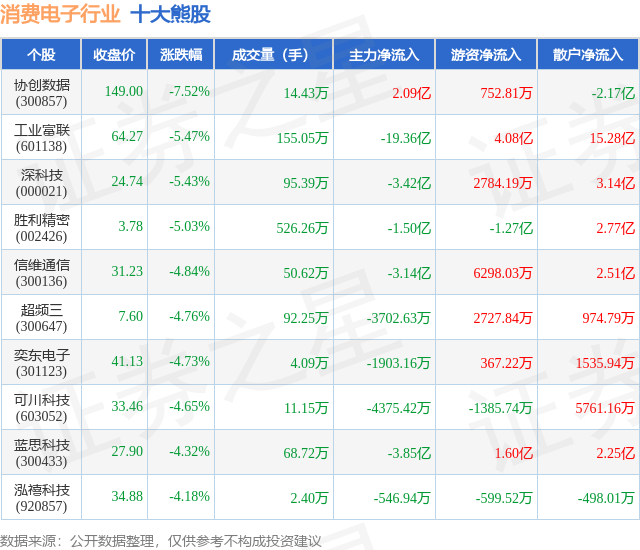 个股表现方面,消费电子行业当日领跌股为协创数据(300857),该股当日报收149.0,下跌7.52%,成交量14.43万,主力资金净流入2.09亿元。工业富联(601138)以下跌5.47%紧随其后,该股当日成交量155.05万,主力资金净流出19.36亿元。除此之外,深科技(000021)、胜利精密(002426)、信维通信(300136)均进入当日熊股之列。具体个股列表见下表: