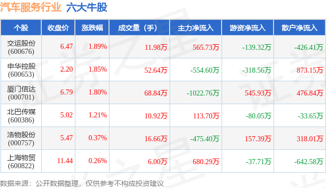 个股表现方面,汽车服务行业当日领涨股为交运股份(600676),该股当日报收6.47,上涨1.89%,成交量11.98万,主力资金净流入565.73万元。申华控股(600653)以上涨1.85%紧随其后,该股当日成交量52.64万,主力资金净流出554.6万元。除此之外,厦门信达(000701)、北巴传媒(600386)、浩物股份(000757)均进入当日牛股之列。具体个股列表见下表: