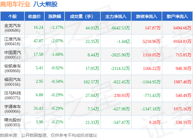 个股表现方面,商用车行业当日领跌股为金龙汽车(600686),该股当日报收16.24,下跌2.17%,成交量44.03万,主力资金净流出6642.53万元。江淮汽车(600418)以下跌2.07%紧随其后,该股当日成交量22.35万,主力资金净流出1.44亿元。除此之外,中国重汽(000951)、安凯客车(000868)、福田汽车(600166)均进入当日熊股之列。具体个股列表见下表: