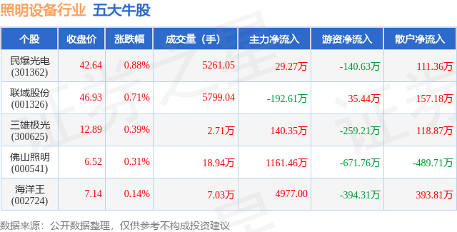 个股表现方面,照明设备行业当日领涨股为民爆光电(301362),该股当日报收42.64,上涨0.88%,成交量5261.0,主力资金净流入29.27万元。联域股份(001326)以上涨0.71%紧随其后,该股当日成交量5799.0,主力资金净流出192.61万元。除此之外,三雄极光(300625)、佛山照明(000541)、海洋王(002724)均进入当日牛股之列。具体个股列表见下表: