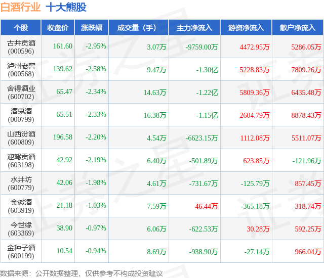 个股表现方面,白酒行业当日领跌股为古井贡酒(000596),该股当日报收161.6,下跌2.95%,成交量3.07万,主力资金净流出9759.0万元。泸州老窖(000568)以下跌2.58%紧随其后,该股当日成交量9.47万,主力资金净流出1.3亿元。除此之外,舍得酒业(600702)、酒鬼酒(000799)、山西汾酒(600809)均进入当日熊股之列。具体个股列表见下表:
