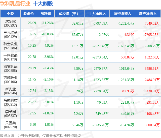 个股表现方面,饮料乳品行业当日领跌股为欢乐家(300997),该股当日报收26.09,下跌11.26%,成交量32.61万,主力资金净流出5797.09万元。三元股份(600429)以下跌10.03%紧随其后,该股当日成交量167.67万,主力资金净流出2.07亿元。除此之外,骑士乳业(920786)、一鸣食品(605179)、熊猫乳品(300898)均进入当日熊股之列。具体个股列表见下表: