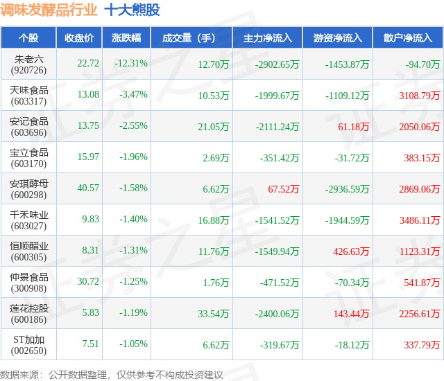 个股表现方面,调味发酵品行业当日领跌股为朱老六(920726),该股当日报收22.72,下跌12.31%,成交量12.7万,主力资金净流出2902.65万元。天味食品(603317)以下跌3.47%紧随其后,该股当日成交量10.53万,主力资金净流出1999.67万元。除此之外,安记食品(603696)、宝立食品(603170)、安琪酵母(600298)均进入当日熊股之列。具体个股列表见下表:
