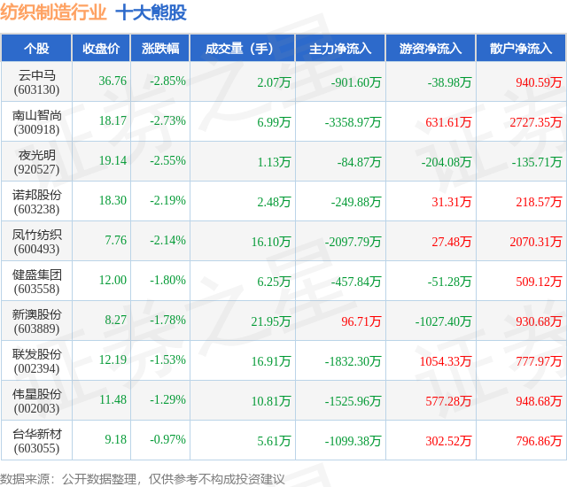 个股表现方面,纺织制造行业当日领跌股为云中马(603130),该股当日报收36.76,下跌2.85%,成交量2.07万,主力资金净流出901.6万元。南山智尚(300918)以下跌2.73%紧随其后,该股当日成交量6.99万,主力资金净流出3358.97万元。除此之外,夜光明(920527)、诺邦股份(603238)、凤竹纺织(600493)均进入当日熊股之列。具体个股列表见下表: