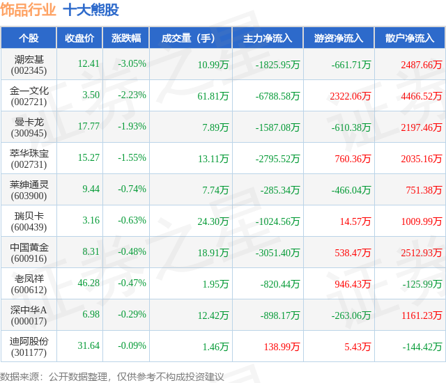 个股表现方面,饰品行业当日领跌股为潮宏基(002345),该股当日报收12.41,下跌3.05%,成交量10.99万,主力资金净流出1825.95万元。金一文化(002721)以下跌2.23%紧随其后,该股当日成交量61.81万,主力资金净流出6788.58万元。除此之外,曼卡龙(300945)、萃华珠宝(002731)、莱绅通灵(603900)均进入当日熊股之列。具体个股列表见下表: