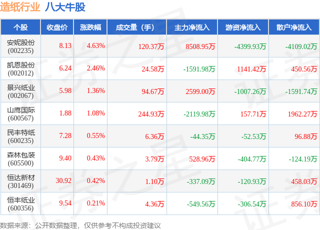 个股表现方面,造纸行业当日领涨股为安妮股份(002235),该股当日报收8.13,上涨4.63%,成交量120.37万,主力资金净流入8508.95万元。凯恩股份(002012)以上涨2.46%紧随其后,该股当日成交量24.58万,主力资金净流出1591.98万元。除此之外,景兴纸业(002067)、山鹰国际(600567)、民丰特纸(600235)均进入当日牛股之列。具体个股列表见下表: