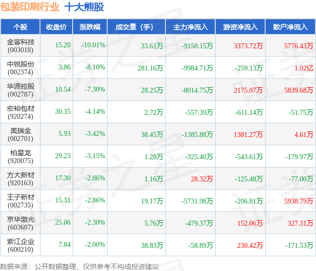 个股表现方面,包装印刷行业当日领跌股为金富科技(003018),该股当日报收15.2,下跌10.01%,成交量33.61万,主力资金净流出9150.15万元。中锐股份(002374)以下跌8.1%紧随其后,该股当日成交量281.16万,主力资金净流出9984.71万元。除此之外,华源控股(002787)、宏裕包材(920274)、奥瑞金(002701)均进入当日熊股之列。具体个股列表见下表: