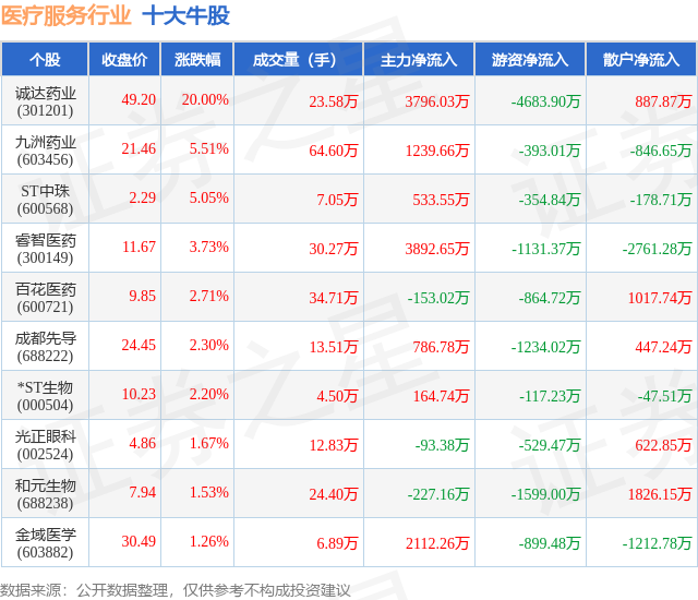 个股表现方面,医疗服务行业当日领涨股为诚达药业(301201),该股当日报收49.2,上涨20.0%,成交量23.58万,主力资金净流入3796.03万元。九洲药业(603456)以上涨5.51%紧随其后,该股当日成交量64.6万,主力资金净流入1239.66万元。除此之外,ST中珠(600568)、睿智医药(300149)、百花医药(600721)均进入当日牛股之列。具体个股列表见下表: